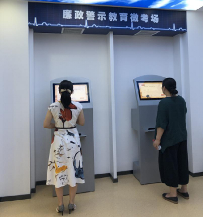 在講解員的引導下,大家依次觀看了序廳展播的《湘水廉波》教育視頻;參觀了以“旗幟”“利劍”“懺悔”“鑄魂”和“前行”五個篇章組成的廉政警示教育展廳;在廉政警示教育微劇場觀看了《改變》;在廉政警示教育微考場進行了《黨紀條規(guī)知識測試》;在長沙電子地圖上,大家紛紛用手掌輕觸感應球,用自己的掌印以示與貪腐劃清界限。